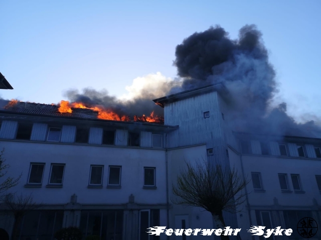 Syke (ts) Die Ortsfeuerwehren Syke, Henstedt und Gessel-Ristedt wurden am 22.04.2020 gegen 17:40 Uhr mit dem Einsatzstichwort „Auslösung Brandmeldeanlege, bzw. Küchenbrand“ in die Waldstraße gerufen. Aufgrund der schnellen Brandausbreitung und großen Anzahl an potenziell gefährdeten Personen im Gebäude, wurden zeitnah auch alle anderen Ortsfeuerwehren der Stadt Syke, zwei weitere Hubarbeitsbühnen, sowie ein Großaufgebot von Rettungsdienst und Polizei alarmiert. In einer sehr geordneten Evakuierung gelang es, auch dank guter Hilfe und Organisation der Heimmitarbeiter, alle Personen aus dem Gebäude zu retten. Hierzu gingen zahlreiche Trupps unter Atemschutz in das Gebäude vor und übergaben die Heimbewohner draußen an den Rettungsdienst. Glücklicherweise war ein Großteil des Gebäudes lange rauchfrei, sodass die Rettung der Bewohner hier auch von Kräften ohne Atemschutz durchgeführt werden konnte. Ein benachbartes Lokal bot an, die Heimbewohner übergangsweise in diesem Gebäude unterzubringen. Für diese unkomplizierte Bereitschaft waren die Einsatzkräfte sehr dankbar. Der Rettungsdienst organisierte anschließend einen Transport in umliegende Krankenhäuser. Um das Feuer endgültig unter Gewalt zu bekommen, erhöhte die Einsatzleitung die Alarmstufe abermals und forderte weitere Kräfte aus den Gemeinden Weyhe, Bassum und Bruchhausen-Vilsen, sowie die „Technische-Einsatzleitung-Nord“ an. Insgesamt waren dadurch rund 380 Kräfte der Feuerwehr, 100 Kräfte des Rettungsdienstes, sowie etwa 20 Beamte der Polizei an der Einsatzstelle. Durch den massiven Personal- und Geräteeinsatz war die Lage gegen 23:30 Uhr soweit unter Kontrolle, dass die meisten Kräfte aus dem Einsatz entlassen werden konnten. Zwei Fahrzeuge der Ortsfeuerwehr Syke blieben noch die ganze Nacht vor Ort, um weitere Kontrollen durchzuführen.