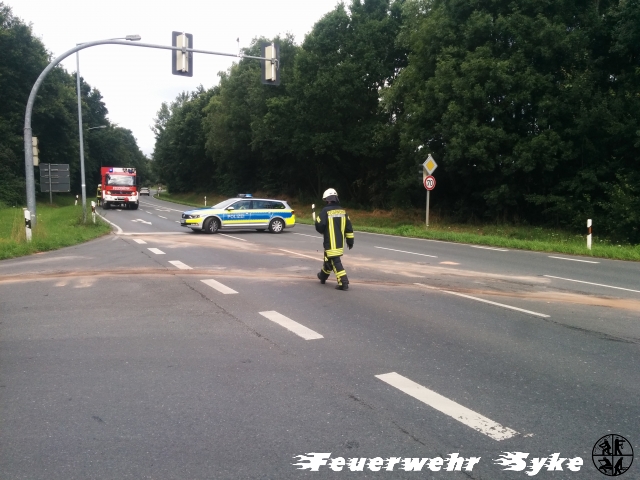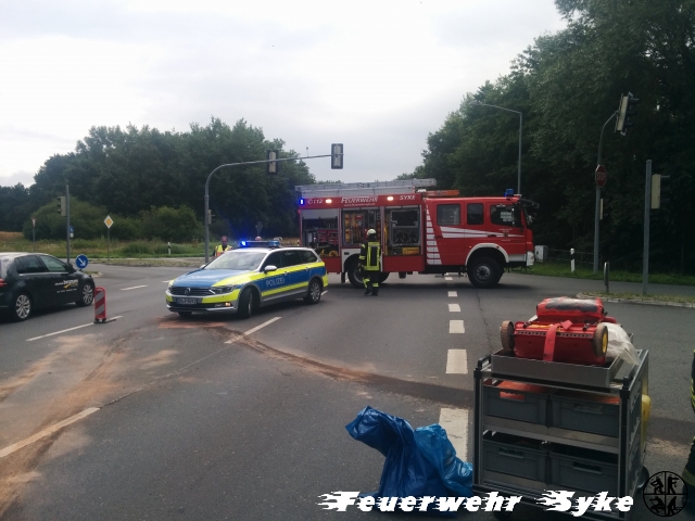Syke (ts) Die Ortsfeuerwehr Syke wurde am 15.07.2020 gegen 08:05 Uhr, mit dem Einsatzstichwort „Verkehrsunfall mit zwei PKW und auslaufenden Be-triebsstoffen“, in den Kreuzungsbereich Gesseler Straße / Nordumgehung (L340) alarmiert. Dort waren zwei Pkw zusammengestoßen, wodurch es zu Verlust von Betriebsstoffen an den Fahrzeugen kam. Mit Hilfe von Bindemittel wurde eine Ausbreitung dieser Flüssigkeiten an der Unfallstelle verhindert. Außerdem „kofferten“ die eingesetzten Kameraden kontaminiertes Erdreich aus, um auch hier Umweltschäden zu verhindern. Eine Person wurde durch den Rettungsdienst in ein Krankenhaus gebracht. Für die Dauer des Einsatzes musste eine Teilsperrung der Kreuzung hergerichtet werden und die Polizei übernahm die Verkehrsregelung. Gegen 09:15 Uhr konnte der Einsatz beendet und die Unfallstelle wieder freigegeben werden. Neben den elf Einsatzkräften der Ortsfeuerwehr Syke, mit zwei Fahrzeugen, waren die Polizei, der Rettungsdienst, der Bauhof der Stadt Syke, sowie ein Abschleppunternehmen im Einsatz.