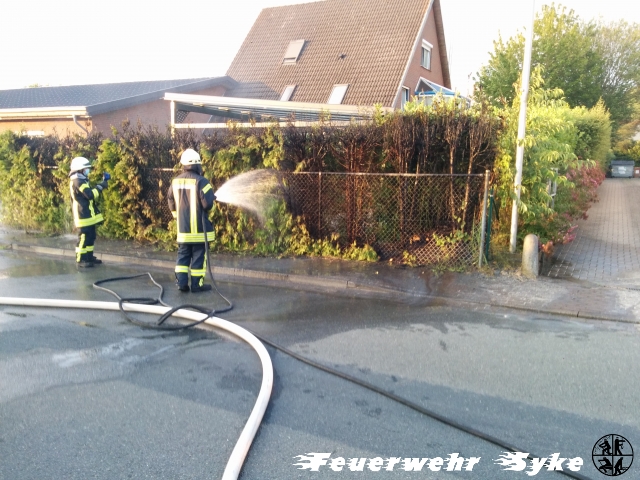 Heckenbrand in Syke Syke (ts) Die Ortsfeuerwehr Syke wurde am 19.07.2021 gegen 20:30 Uhr mit dem Einsatzstichwort „F1-Heckenbrand“ in die „Carl-Zeiss-Straße“, im Syker Industriegebiet alarmiert. Beim Eintreffen der ersten Einsatzkräfte stand eine Hecke auf einer Länge von ca. 5m in Brand. Mit mehreren C-Rohren wurde ein Löscheinsatz von beiden Seiten durchgeführt. Anwohner hatten die Löscharbeiten zuvor bereits mit eigenen Handfeuerlöschern begonnen. Zehn Minuten nach der Eintreffmeldung konnte die Ortsfeuerwehr Syke „Feuer aus“ melden. Im Einsatz waren 19 Einsatzkräfte der Feuerwehr, mit drei Fahrzeugen, nebst einem Funkstreifenwagen der Polizei Syke.