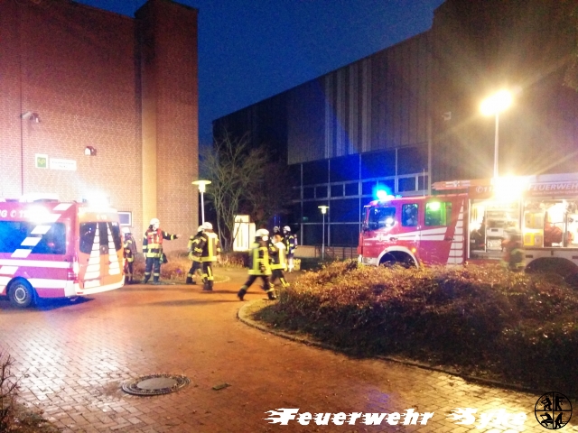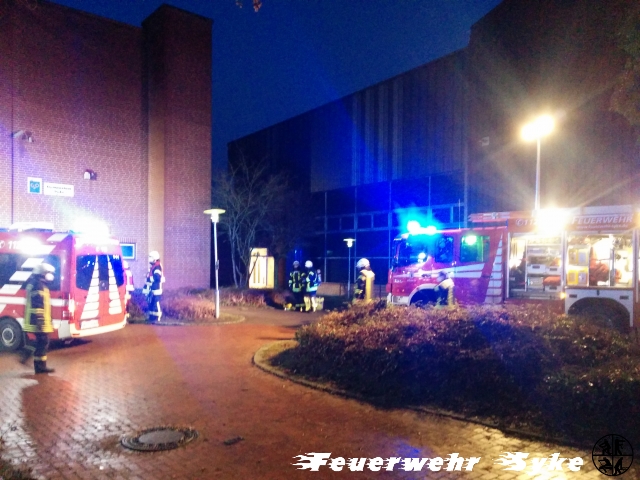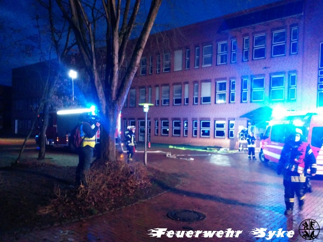 Bei dem Gebäudekomplex handelt es sich um das Theater nebst dem angrenzenden Gymnasium Syke. Die Suche nach dem Brandherd gestaltete sich schwierig, denn ausgelöst hatte die Brandmeldeanlage des Theaters, hier war aber initial kein Brandrauch zu sehen. Der vorgehende Angriffstrupp konnte das Feuer schließlich im Kellergeschoss des Schulteils ausfindig machen. Der Brandrauch hatte sich in Richtung Theater ausgebreitet und so den Alarm ausgelöst.