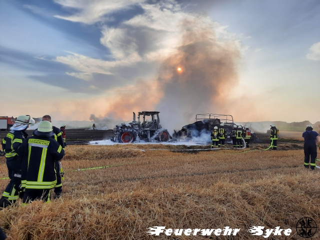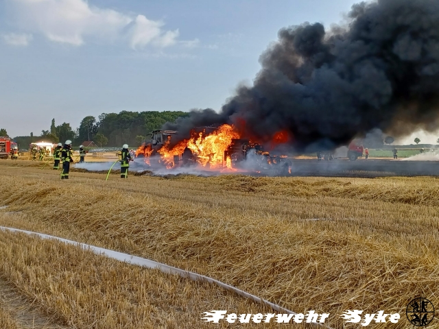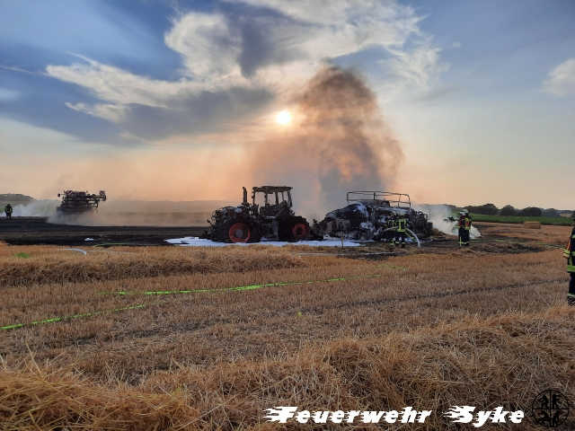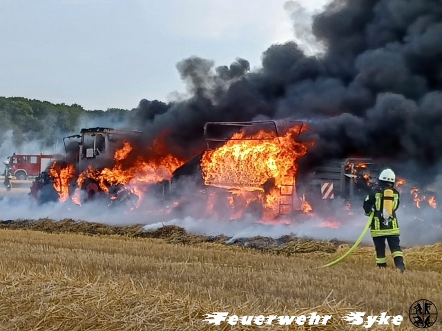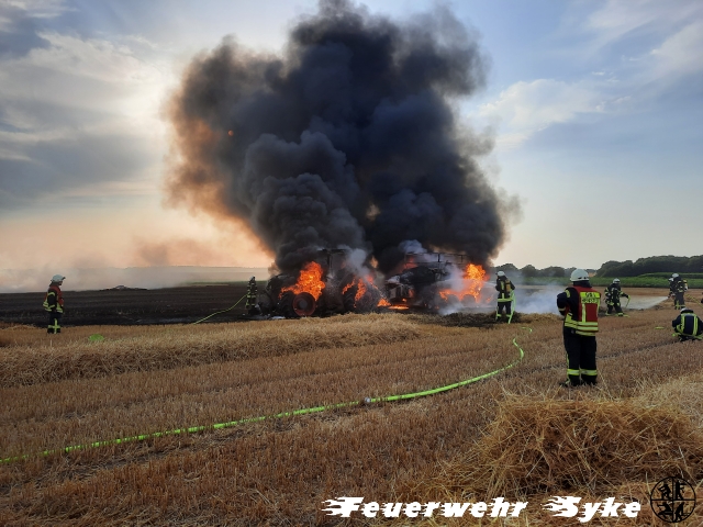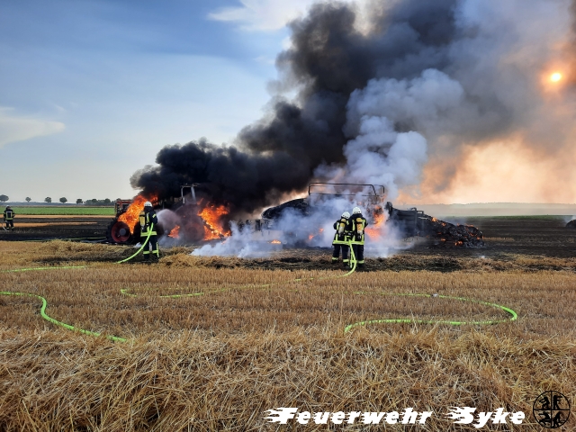 Auf einem Getreidefeld kam es zu einem Brand an einem Gespann aus Schlepper und Quaderballenpresse, der sich durch den leichten Wind schnell in eine Richtung auf dem Feld ausbreitete.