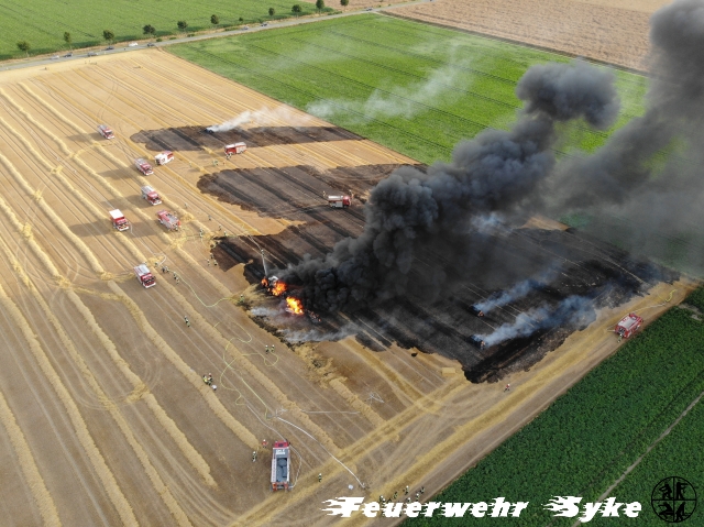Aufgrund der schnellen Brandausbreitung, sowie der weit entfernten nächsten Wasserentnahmestelle wurden die wasserführenden Fahrzeuge der Ortsfeuerwehren Barrien und Syke hinzugezogen. Um sich einen Überblick aus der Vogelperspektive zu schaffen alarmierte die Leitstelle eine Drohnengruppe der Kreisfeuerwehr.