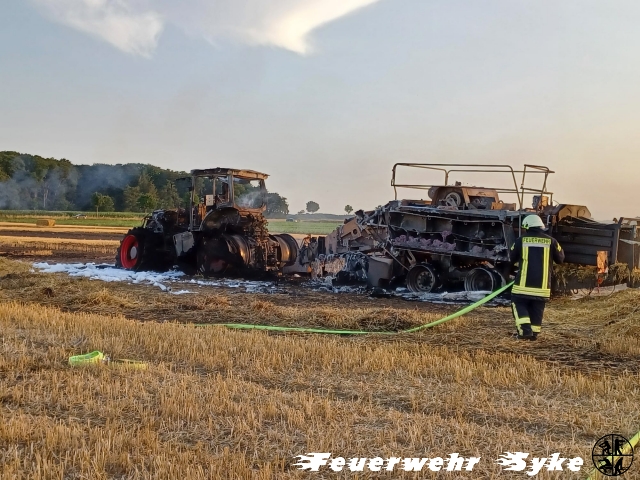 Parallel wurde ein Löschangriff an Presse und Zugmaschine, sowie eine Riegelstellung zu den benachbarten Feldern aufgebaut. Diese waren glücklicherweise unter anderem mit Rüben bepflanzt, daher konnte sich das Feuer hier nicht mehr so schnell weiter entwickeln. Trotz des massiven Löschangriffs brannten Zugmaschine und Presse komplett aus. Ca. 1,8 ha des Getreidefel des brannten ebenfalls ab. Dem Fahrer des Gespanns passierte nichts. Außer leichter Erschöpfungserscheinungen durch Hitzestau unter der Einsatzkleidung, gab es auch bei den Einsatzkräften keine Verletzungen. Da die Presse mit bereits gepresstem Stroh gefüllt war, welches immer wieder aufglimmte, musste diese komplett leer gemacht werden. Diese Arbeit zog sich über mehrere Stunden hin. Zwei Landwirte unterstützten die Einsatzkräfte, indem sie die betroffene Fläche gründlich grubberten.