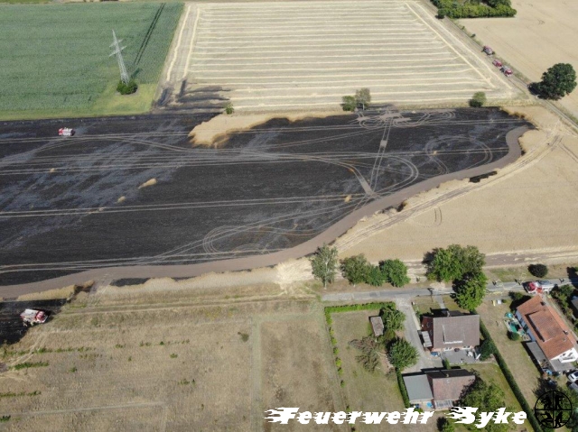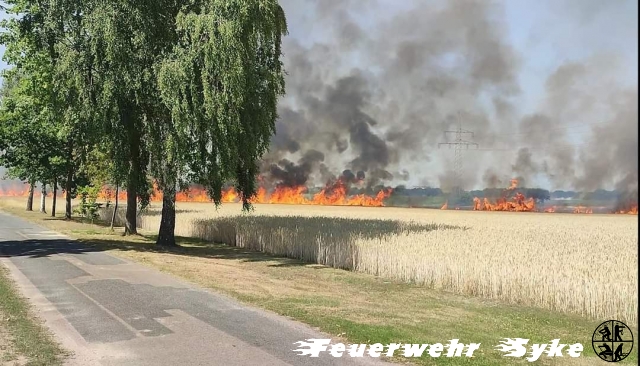 Der örtliche Einsatzleiter erkannte sofort, dass es sich nicht um eine statische Lage handelte, sondern dass sich der gemeldete Mähdrescherbrand rasend schnell zu einem großen Flächenbrand entwickelte. Das betroffene Getreidefeld, direkt hinter dem Feuerwehrhaus Gessel-Ristedt, war noch nicht abgeerntet und bot daher viel Brandlast für die Flammen. Sofort wurde die Alarmstufe erhöht und die Ortsfeuerwehren Barrien, Gödestorf, Heiligenfelde, Okel und Syke, sowie das Tanklöschfahrzeug aus Fahrenhorst nachalarmiert. Da eine Wasserversorgung über die ca. 8ha betroffene Fläche mittels Schlauchleitungen kaum möglich war, wurden die Tanklöschfahrzeuge aus Heiligenrode, Seckenhausen, Sudweyhe, Nordwohlde und Kirchseelte (LK Oldenburg), sowie die Ortsfeuerwehr Henstedt hinzugezogen.