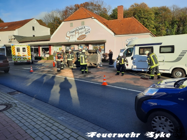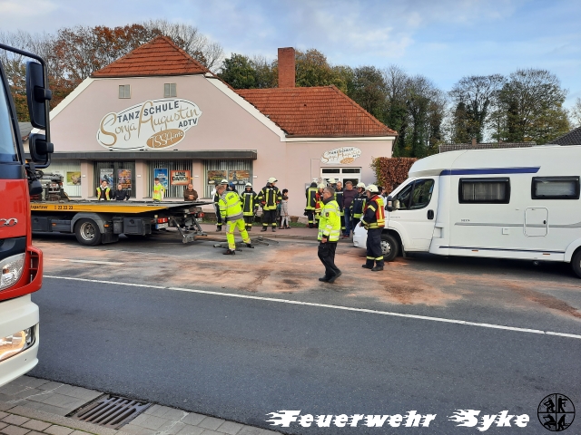 Dort hatte sich ein Verkehrsunfall zwischen einem PKW und einem Wohnmobil ereignet. Beim Eintreffen der Feuerwehr wurden die Betroffenen bereits vom Rettungsdienst behandelt und die Polizei hatte die Einsatzstelle abgesichert. Keiner der Patienten war in den Fahrzeugen eingeschlossen, oder eingeklemmt. Die Ortsfeuerwehr Syke konnte sich auf das binden der auslaufenden Betriebsmittel kümmern. Anschließend holten sie die Einsatzkräfte, über das sogenannte Crash-Recovery-System, Daten der beteiligten Fahrzeuge „an“ die Einsatzstelle, um alle Stromquellen trennen zu können und so eine Brandentstehung zu verhindern.