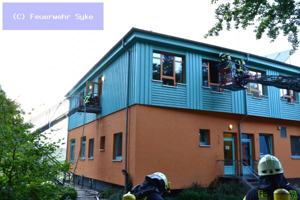 In einer Betreuungsanstalt löst die automatische Brandmeldeanlage aus. Noch auf Anfahrt der Einsatzkräfte stellt sich heraus, dass es eine Rauchentwicklung im Gebäude gibt. Alle Bewohner der Anstalt hatten das Gebäude rechtzeitig verlassen. Das Treppenhaus ist stark verqualmt und ist ohne Atemschutz nicht mehr begehbar. Als Ursache wird ein Bett ausfindig gemacht, welches Feuer gefangen hat. Die Feuerwehr löscht das Feuer mit einer geringen Menge Wasser und befreit das Gebäude von dem Brandrauch.Pressemeldung 26 /2014 Zimmerbrand in Syker Wohnheim Syke. Ein Zimmerbrand führte zur Auslösung der Brandmeldeanlage eines Wohnheims einer Hilfseinrichtung in der Nordwohlder Straße am Donnerstag Abend (11.09.2014, 18:52 Uhr). Durch den Rückruf der Feuerwehr- und Rettungsleitstelle im Wohnheim konnte ein Brand bestätigt werden und umgehend nach der Alarmierung der Ortsfeuerwehr Syke wurden die Ortsfeuerwehren Henstedt und Barrien zur ausreichenden Vorhaltung von Atemschutzgeräteträgern und Sicherstellung der Löschwasserversorgung hinzualarmiert. Die Bewohner konnten sich derweil eigenständig in Sicherheit bringen. Dabei kam es bei zwei Personen zu einer leichten Verletzung durch Einatmen von Rauchgasen, sodass nach einer Betreuung durch den Rettungsdienst eine Person in ein Krankenhaus zur weiteren Untersuchung verbracht wurde. Im Erstangriff wurde über die Drehleiter von außen ein Zugang zu dem Brandraum im ersten Obergeschoss geschaffen, um eine Brandausbreitung zu verhindern und einen ersten Löscherfolg zu erzielen. Der bereits evakuierte Brandschutzabschnitt im betroffenen Trakt war weiträumig verraucht, sodass weitere Atemschutztrupps einen Innenangriff über den äußeren Fluchtweg vornahmen. Durch Einsatz von Lüftern konnte der innere Fluchtweg über das Treppenhaus rauchfrei gehalten werden, sowie später der betroffene Bereich entraucht werden. Nach ca. 40 Minuten konnte unter Einsatz einer Wärmebildkamera „Feuer aus“ gemeldet werden und im daruntergelegenen Erdgeschosszimmer wurde Mobiliar vor Löschwasser in Sicherheit gebracht. Bis auf die beiden vom Einsatz betroffenen Zimmer konnten die Räumlichkeiten zum Einsatzende von den Bewohnern wieder benutzt werden. Nach knapp zwei Stunden war der Einsatz für die 74 Feuerwehrkameraden beendet. Über die Schadenshöhe können keine weiteren Angaben gemacht werden. Die polizeilichen Ermittlungen wurden aufgenommen. Gez. Ihno Fißer, Pressewart der Stadtfeuerwehr Syke