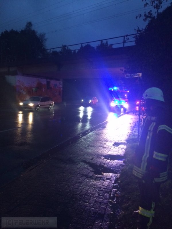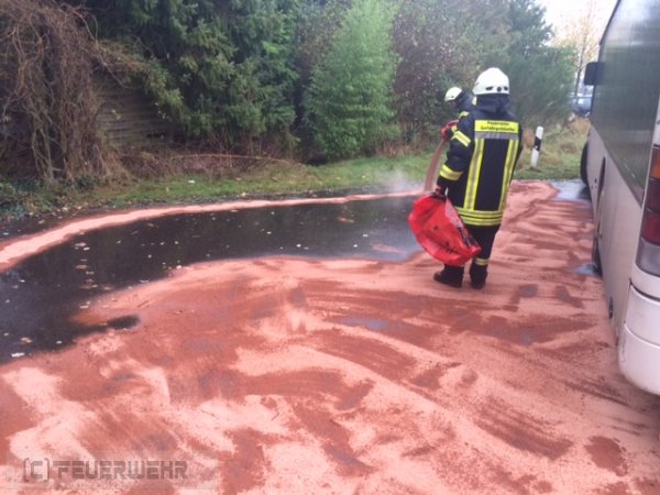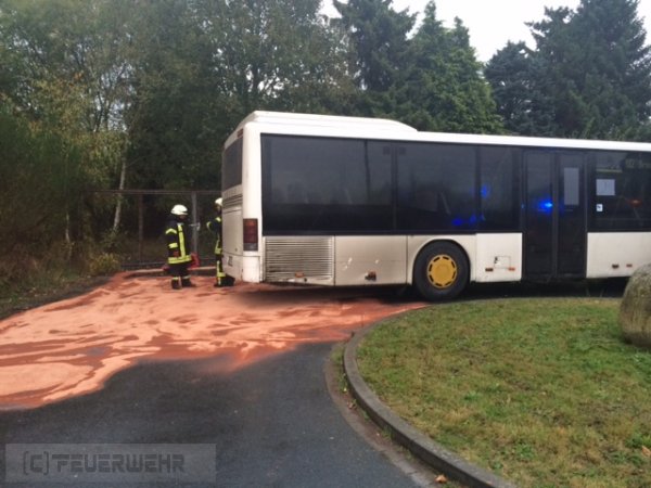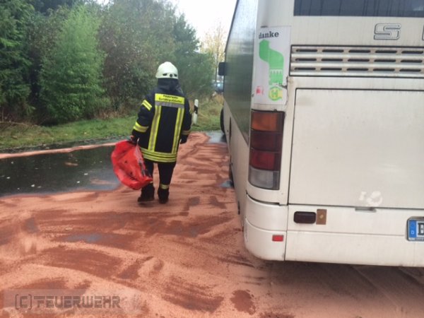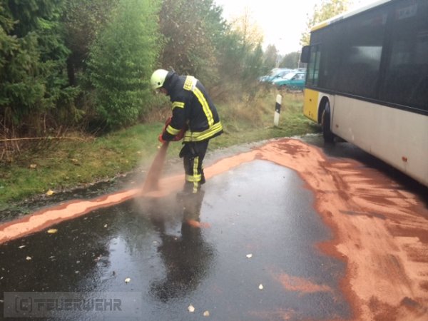 Die Feuerwehr rückte zur Unterstützung des Bauhofs aus. Bei einem Linienbus war ein Hydraulikschlauch geplatzt. Das auslaufende Hydrauliköl verteilte sich durch den anhaltenden Starkregen schnell auf der Fahrbahn und lief in die Kanalisation. Das Öl wurde mit Ölbindemittel aufgenommen. An den Ausläufen der Regenrückhaltebecken Am Suurend, am Kreishaus und an der L333 wurden je eine Ölsperre gesetzt, um das aus der Kanalisation kommende Öl zu stoppen und aufzunehmen. Zur Unterstützung kam die Feuerwehr Henstedt und ein Entsorgungsunternehmen hinzu.