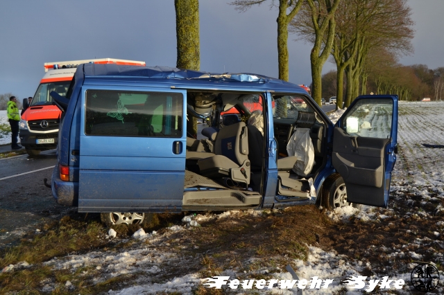 abgekommen und mit ihrem VW-Bus mit der Fahrerseite knapp hinter dem Fahrersitz gegen