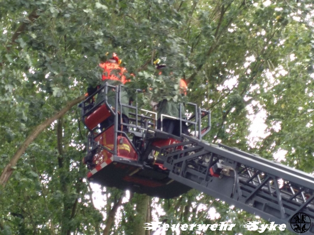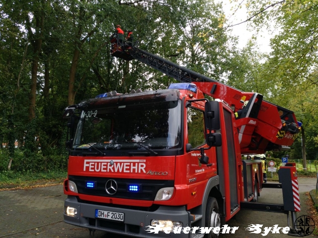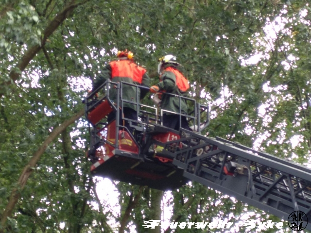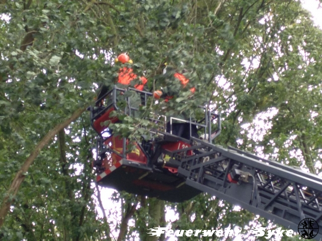 Die Ortsfeuerwehr Syke wurde zum Kreishaus alarmiert, da dort ein Baum umgestürzt war und große Teile eines weiteren Baumes herausgebrochen waren. Der umgestürte Baum blockierte keine Wege und stellte auch sonst keine weitere Gefahr dar, sodass Maßnahmen der Feuerwehr nicht erforderlich waren. Die Teile des anderen Baumes, die sowohl Fußgänger als auch parkende Fahrzeuge gefährdeten wurden mit Hilfe der Drehleiter und einer Kettensäge entfernt.