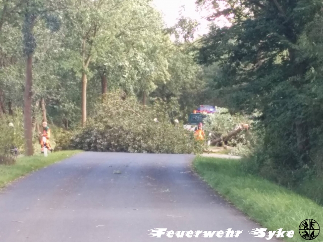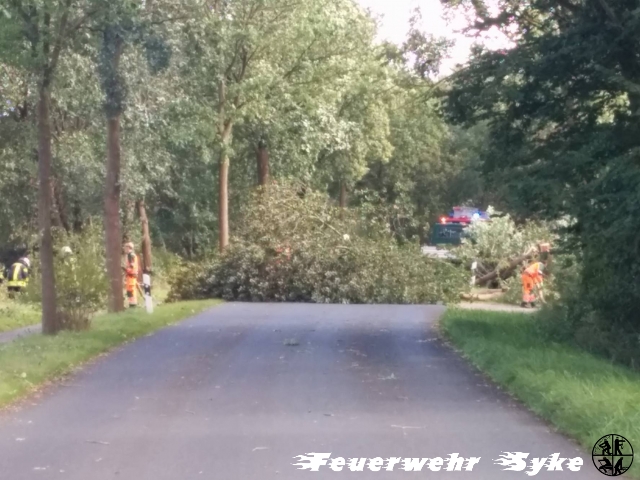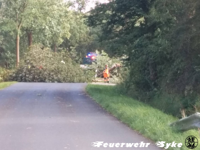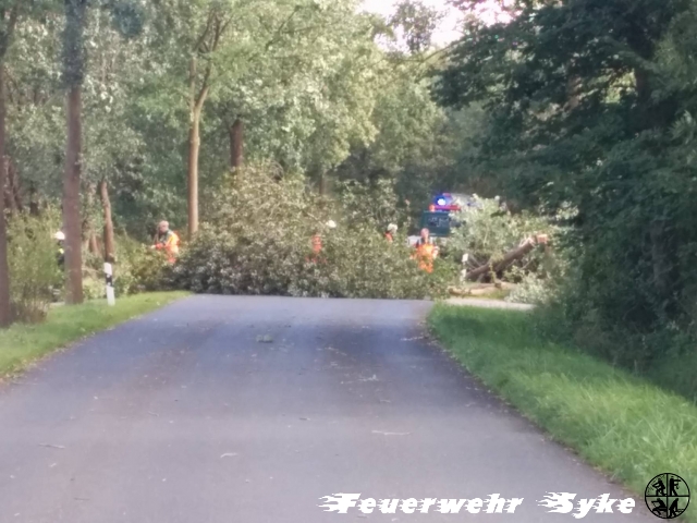 Ein Baum war umgeknickt und musste entfernt werden. Da der Bauhof der Stadt Syke bereits vor Ort war, übernahm die Ortsfeuerwehr Syke die Verkehrsabsicherung der Einsatzstelle. Die Straße musste für einige Minuten vollgesperrt werden, um den Baum zu fällen.