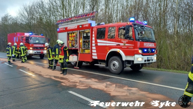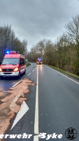 Auf dem Abbiegefahrstreifen an einer Ampelkreuzung war ein PKW in Brand geraten. Beim Eintreffen der Einsatzkräfte war der Brand bereits erloschen. Hinter dem Farzeug erstreckte sich eine Ölspur über eine Strecke von etwa 250 m, die mit Bindemittel abgebunden wurde.