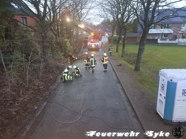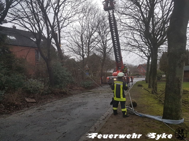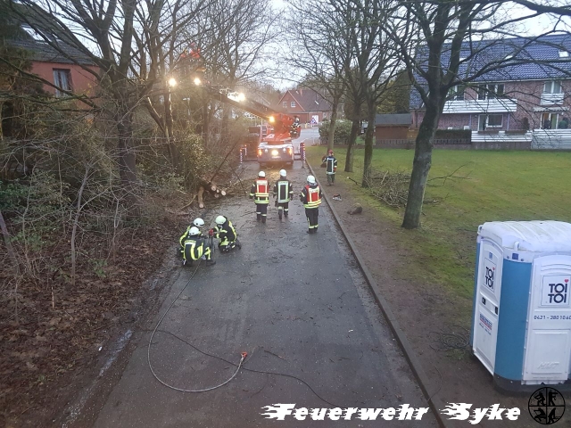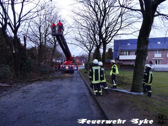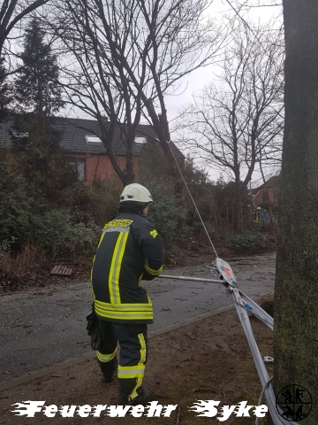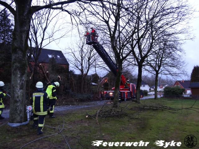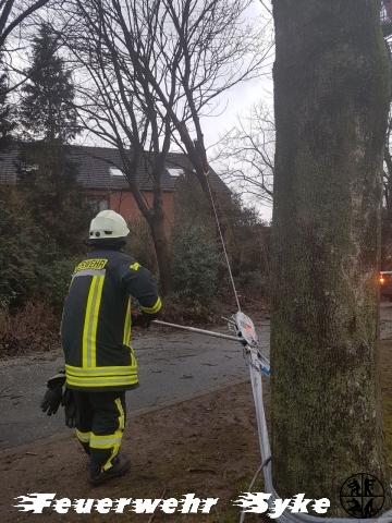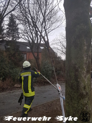 Ein Baum war gebrochen und hing in einem anderen Baum. Da der Baum weiterhin drohte auf die Fahrbahn zu fallen, wurde der Baum entfernt.