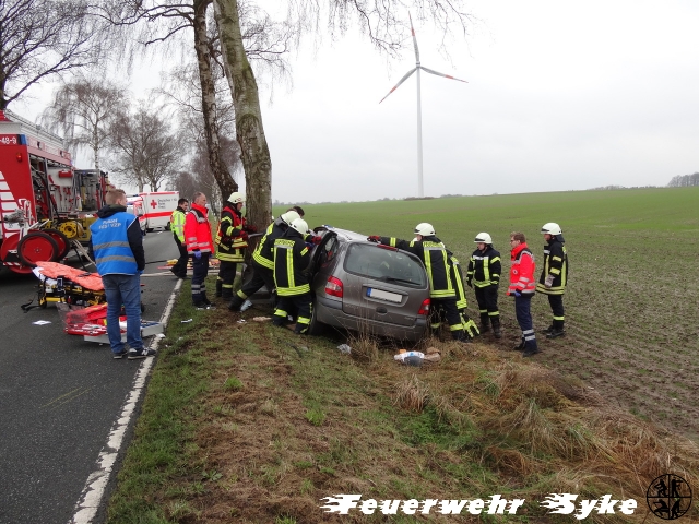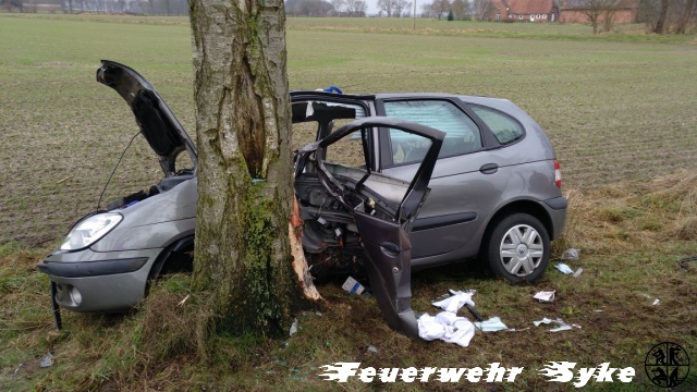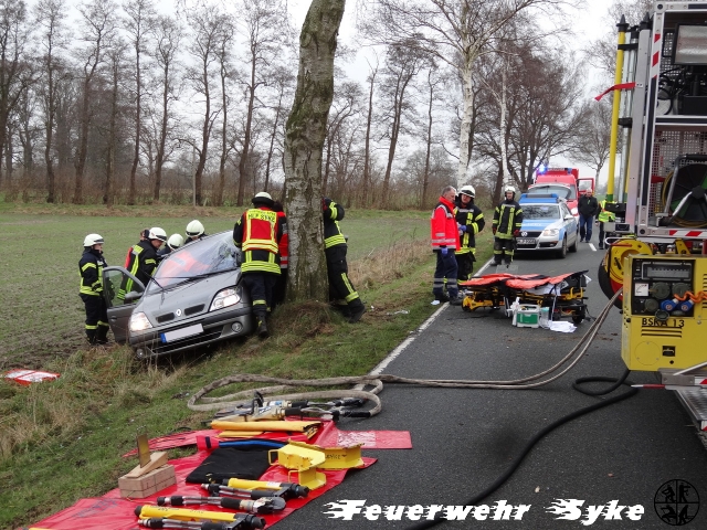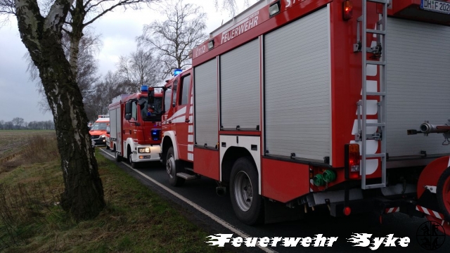 Henstedt (if) Eine ältere Dame befuhr mit ihrem Renault am Donnerstag Morgen (25.01.2018, 11:09) die Straße Unter den Eichen (L356) von Heiligenfelde in Richtung Jardinghausen, als sie aus ungeklärter Ursache von der Straße abkam. Sie prallte mit der Fahrerseite gegen einen Baum. Der Gerätewart der Ortsfeuerwehr Jardinghausen befand sich mit dem Feuerwehrfahrzeug gerade auf den Weg zur Feuerwehr-Technischen Zentrale in Barrien, als er auf die Unfallstelle zu kam. Er übernahm die Erstversorgung der Fahrerin und bemerkte wie einige PKWs, kurz schauend, vorbei fuhren, ohne anzuhalten und zu helfen. Als dann endlich jemand anhielt, übernahm dieser die einfachste Hilfe die jeder leisten kann: er setzte den Notruf ab. Durch die starken Deformierungen der Türen auf der Fahrerseite war die Fahrerin eingesperrt, aber nicht eingeklemmt. Sie war ansprechbar, hatte aber starke Schmerzen. Die Polizei nahm bereits in Heiligenfelde an der Bundesstraße eine Vollsperrung vor, sodass die Straße längere Zeit nicht genutzt werden konnte. Die alarmierten Feuerwehren Henstedt und Syke nahmen die technische Rettung unter Abstimmung mit dem Rettungsdienst vor. Sie konnten sich Zugang über die Beifahrerseite verschaffen. Zur Sicherheit war der Rettungshubschrauber Christoph 6 hinzu alarmiert worden. Nach dem die stabilisierte Patientin über die Beifahrerseite gerettet werden konnte, wurde sie mit dem Rettungswagen in ein Krankenhaus transportiert. Für die 30 Feuerwehrkräfte war der Einsatz nach anderthalb Stunden
