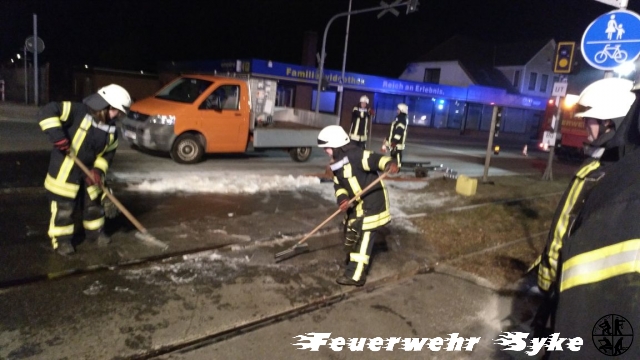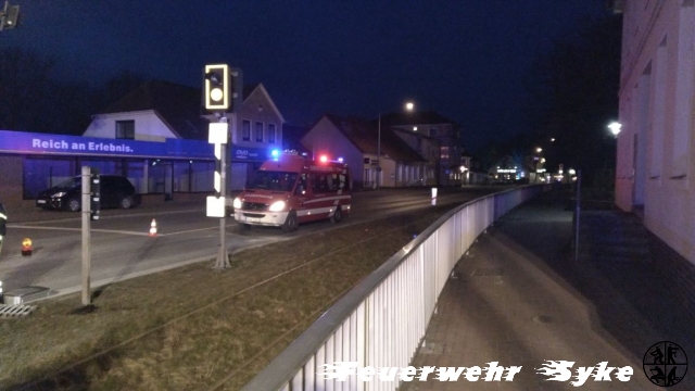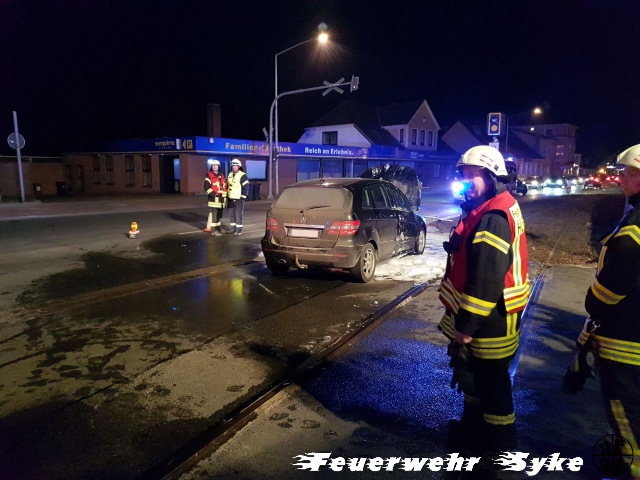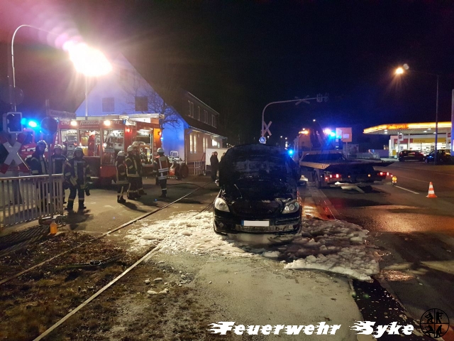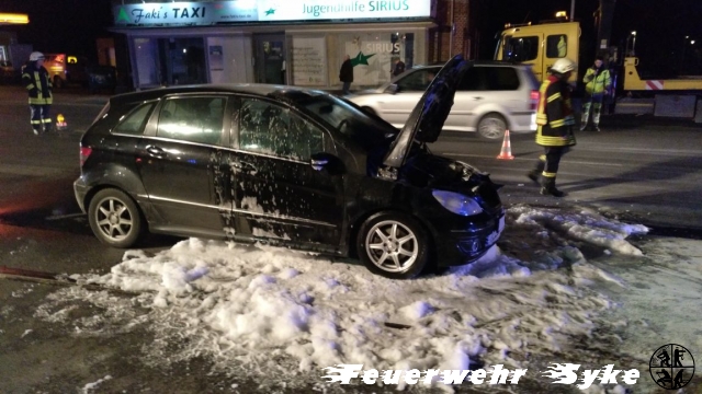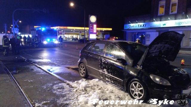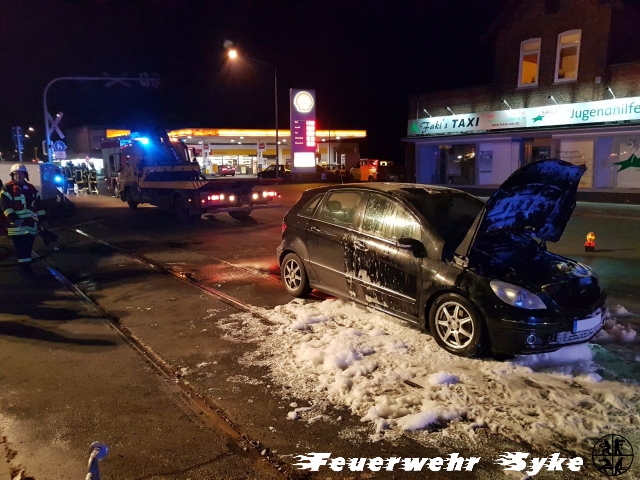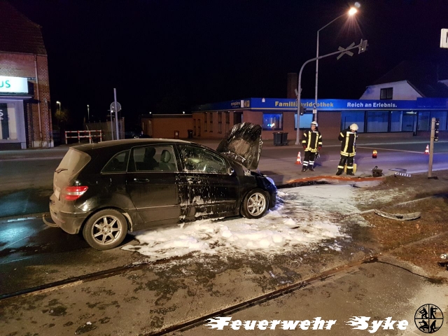 Ein Fahrzeug war auf der Bundesstraße 6 in Brand geraten. Das Feuer wurde durch zwei Atemschutztrupps mit Schaum bekämpft, nachdem Ersthelfer bereits Löschversuche mit einem Feuerlöscher unternommen hatten.Während der Löscharbeiten musste die Bundestrasse 6 zeitweise vollgesperrt werden. Ausgetretene Betriebstoffe und Löschmittel wurden mit Hilfe des Bauhofes der Stadt Syke aufgefangen und abtransportiert. Das Fahrzeug wurde durch einen Abschleppdienst abtransportiert und die Einsatzstelle an die Polizei übergeben.