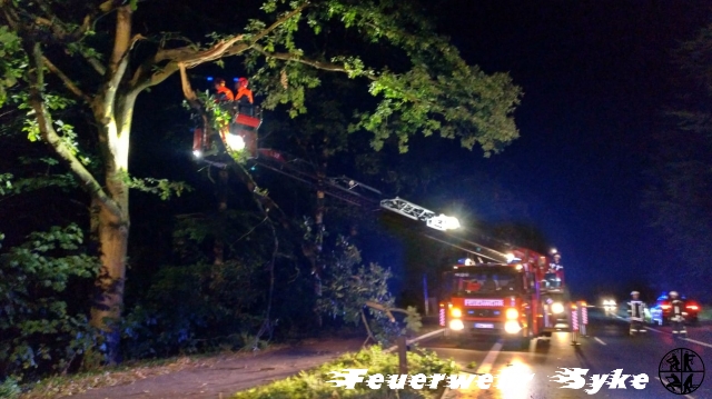 Die Ortsfeuerwehr Syke wurde alarmiert, da ein Ast aus einem Baum gebrochen war und die Bundestraße 6 teilweise blockierte. Der Ast wurde schnell mit einer Motorkettensäge entfernt und ein weiterer Ast mit Hilfe der Drehleiter und einer Motorkettensäge ebenfalls aus der Baumkrone geschnitten, um eine weitere Gefährdung durch diesen zu verhindern. Die Bundestraße 6 musste für die Dauer der Arbeiten vollgesperrt werden, nach deren Abschluss war sie aber wieder voll befahrbar.