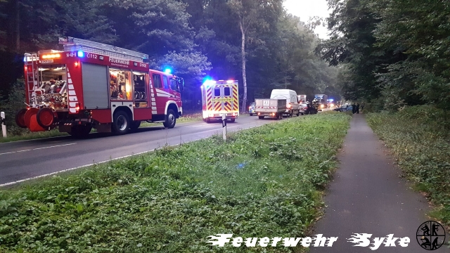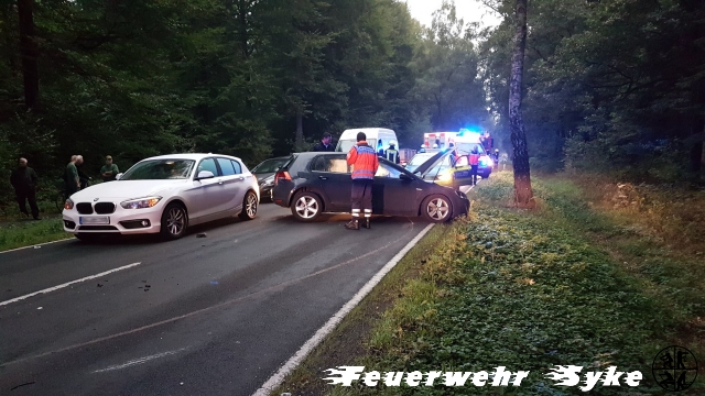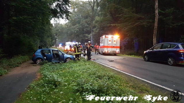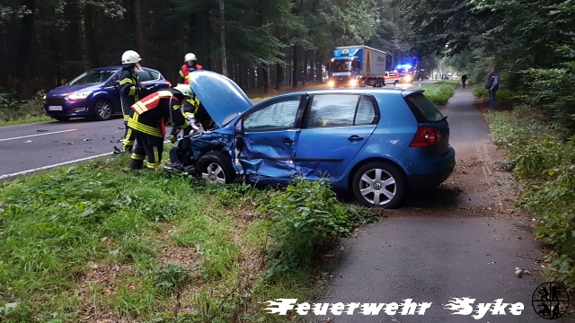 Syke (if) Heute morgen (12.09.2018, 7 Uhr) wurde die Ortsfeuerwehr Syke zu einem Verkehrsunfall mit zwei PKWs und mindestens zwei eingeklemmten Personen auf die Bassumer Landstraße (L333), in Höhe der Westermark, zwischen Syke und Bramstedt gerufen. Beim Eintreffen der 18 Einsatzkräfte hatten Ersthelfer beide Fahrzeugführer aus ihren verunfallten PKW befreien können. Der Rettungsdienst traf mit einem Norarzteinsatzfahrzeug und zwei Rettungswagen ein und kümmerte sich um die mittelschwer verletzten, aber ansprechbaren Personen. Beide Personen, eine 42jährige sowie ein 28jähriger, wurden zur Kontrolle in Bremer Krankenhäuser verbracht. Nach dem frontalen Zusammenstoß, bei dem die jeweils linke vordere Fahrzeughälfte stark beschädigt wurde, touchierte der eine Golf einen nachfolgenden BMW leicht. Dessen Fahrer wurde nicht verletzt und konnte Erste Hilfe leisten. Ein weiterer hinterherfahrender PKW-Fahrer leistete ebenfalls Erste Hilfe, war nach den heftigen Eindrücken anschließend nicht mehr fahrsicher und ließ sich nach Hause begleiten. Die Polizei war mit zwei Streifenwagen vor Ort. Die Straße war bis zur Abholung der beiden verunfallten PKW für ein Stunde vollgesperrt. Die Maßnahmen der Feuerwehr beschränkten sich auf die Absicherung der Einsatzstelle. Sie sperrte die Straße, stellte den Brandschutz sicher, verhinderte ein Eindringen der Betriebsstoffe in den Wegeseitenraum und klemmte die Fahrzeugbatterien ab. Die beiden Golf erlitten einen erheblichen Schaden. Die Polizei hat ihre Ermittlungen zum Unfallhergang aufgenommen. Weitere Personen kamen nicht zu Schaden.