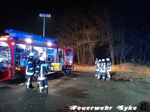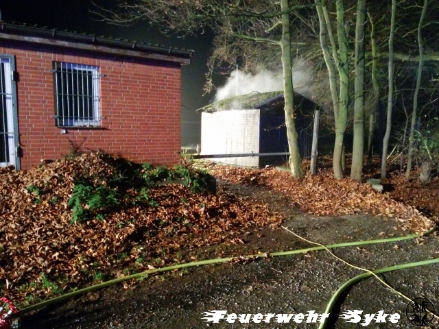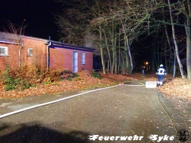 Die Ortsfeuerwehr Syke wurde zum Brand eines Geräteschuppens alarmiert. Das Feuer im Schuppen konnte schnell durch zwei Trupps unter Atemschutz mit je einem C-Rohr bekämpft werden. Die Einsatzstelle wurde ausgeleuchtet und sämtliche Glutnester wurden abgelöscht. Die ebenfalls alarmierte Ortsfeuerwehr Leeste musste nicht mehr tätig werden.