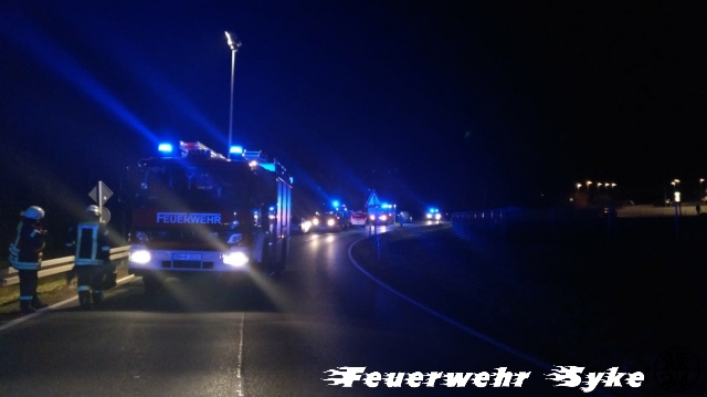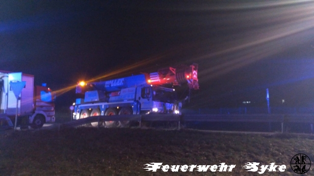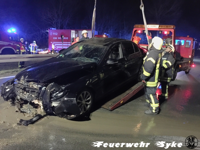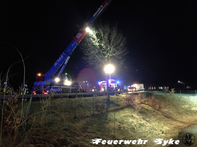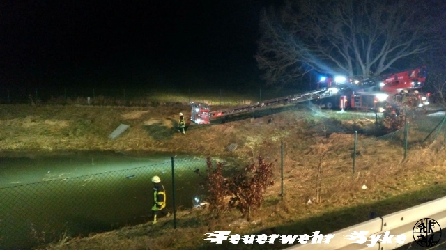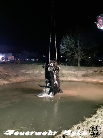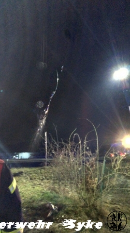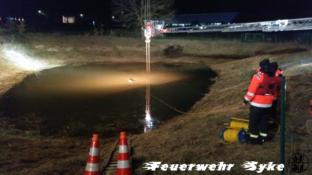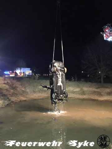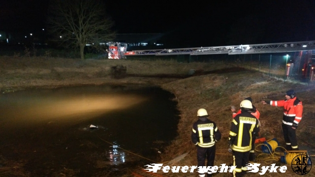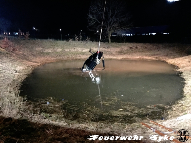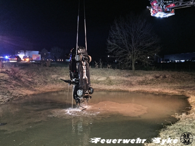 Die Ortsfeuerwehr Syke wurde zu einem Verkehrsunfall in unmittelbarer Nähe des Feuerwehrhauses alarmiert. Ein Pkw war in einer Linkskurve von der L340 (Nordumgehung) abgekommen, überfuhr eine Grünfläche und kam dann, nachdem er einen Zaun durchbrochen hatte, in einem Regenrückhaltebeckken zum Stehen. Der Fahrer konnte sich selbst und unter Zuhilfenahme eines Ersthelfers aus dem Fahrzeug befreien und wurde vom Rettungsdienst aufgrund einer Unterkühlung behandelt. Das Fahrzeug versank schließlich komplett im Regenrückhaltebecken. Für die Bergung des Fahrzeuges wurde die Nordumgehung zwischen der Max-Planck-Straße und Gesseler Straße gesperrt. Um das Fahrzeug aus dem Gewässer zu heben wurde eine Firma mit einem Kran angefordert und die Taucher der Berufsfeuerwehr Bremen. Die Taucher konnten das Fahrzeug soweit sichern und anschlagen, dass es mit Hilfe des Kranes geborgen und vom Abschleppdienst abtransportiert werden konnte.