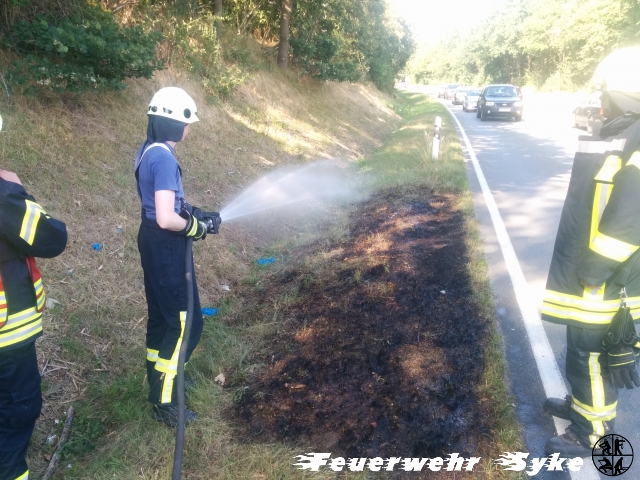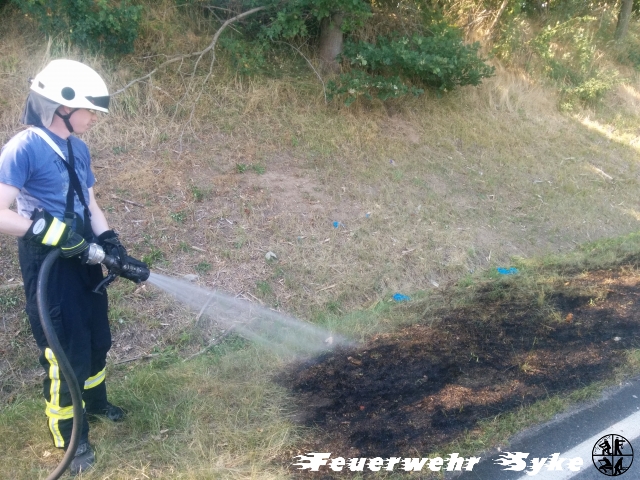 Die Orstfeuerwehr Syke wurde zu einem Flächenbrand gegenüber des eigenen Feuerwehrhauses alarmiert. Dort hatten einige Quadratmeter Grünfläche gebrannt. Die Besatzung eines Funkstreifenwagens der Polizei hatte das Feuer bereits mit einem Pulverlöscher gelöscht, sodass die Fläche von der Feuerwehr anschließend nur noch ausreichend gewässert werden musste.