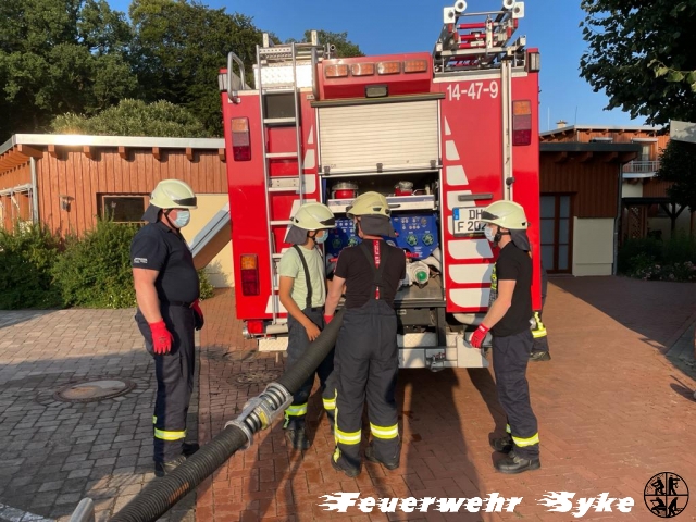 Für den Ausbildungsdienst kamen Ausbilder und Teilnehmer aus verschieden Ortsfeuerwehren der Stadt Syke zusammen. Im Mittelpunkt stand die Wasserförderung über lange Wegstrecken. Das Wasser wurde aus dem Amtsteich hinter dem Kreishaus mit einer Tragkraftspritze angesaugt, im Ring mit mehreren Pumpen und Fahrzeugen gefördert und dann wieder über einen Wasserwerfer in den Amtsteich abgegeben. Neben der Wasserförderung wurden an diesem Abend noch weitere Dinge gelehrt, die mit einer solchen Lage einher gehen, wie z.B. das Absichern und Ausleuchten einer Einsatzstelle.