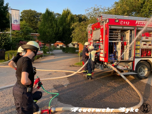 So übte u.a. auch die 2. Gruppe am 22. Juli das Nebenschlussverfahren. Beim Nebenschlussverfahren wird Löschschaum erzeugt. Dabei wird das Schaummittel in einem Nebenstrom dem Löschwasser beigemengt, sodass in der Pumpe eine sehr gute Durchmischung von Löschwasser und Schaummittel erreicht werden kann. Außerdem wurde der Löschwasserbrunnen mit stationärer Pumpe am Kinderhospiz Löwenherz in Augenschein genommen und getestet.