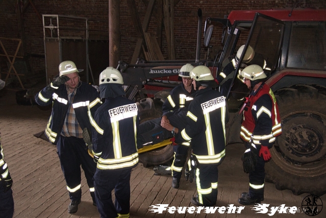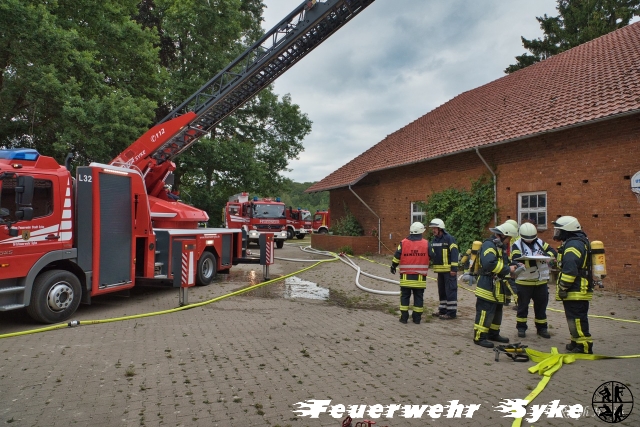 rh. Schwelbrand im ehemaligen Reiterhof an der Henstedter Str. 38 in Syke- Henstedt, so lautete die Einsatzmeldung am 27. Juni., gegen 19.00 Uhr, für die Ortsfeuerwehr Henstedt und für den 1. Zug der Ortsfeuerwehr Syke. In den leeren Stallungen des Reiterhofes war ein Schwelbrand mit erheblicher Rauchentwicklung ausgebrochen, mindestens sieben Personen befinden sich noch im stark verqualm-ten Gebäude. Ausgearbeitet hatten dieses Übungsszenario der Henstedter Ortsbrandmeister Herbert Weber zusammen mit Zugführer Reiner Meyer aus Syke.