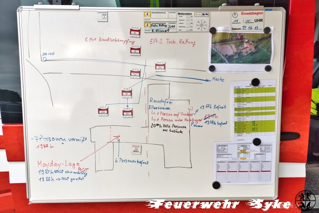 Nach Beendigung der Einsatzübung, an der etwa 40 Einsatzkräfte teilnahmen, er-folgte eine Nachbereitung, bei der auch kritische Punkte angesprochen wurden. Ortsbrandmeister Weber und auch Reiner Meyer hätten bei diesem Gebäudekomplex mit Sicherheit Stadtalarm auslösen lassen, um mehrere Wehren mit Tanklöschfahrzeugen und Wasserversorgung, sowie mehr Personal einsetzen zu können. Eine größere Anzahl an Atemschutzgeräteträgern hätte die Suche nach vermissten Personen ebenfalls erheblich beschleunigt.