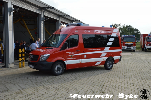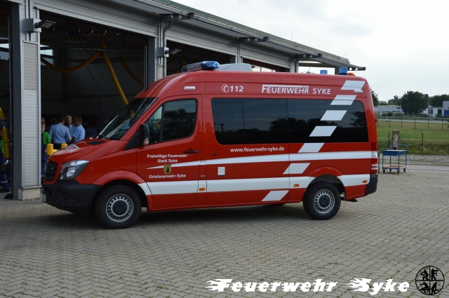 Der bisherige Syker MTW, ein Ford Transit Baujahr 2002, war in ein Alter gekommen, wo sich die Reparaturen häuften und nicht mehr wirtschaftlich waren. Im April traf sich mit Ortsbrandmeister Fabian Fricke, seinem zweiten Stellvertreter Matthias Horstmann, Gerätewart Ralf Hoberg, Zugführer Reiner Meyer und Jugendwart Christoph Meyer ein Arbeitskreis, der die Wunschvorstellungen der Ortsfeuerwehr definierte und gleich mit der Internet-Recherche begann. Wie auch bereits bei der Ortsfeuerwehr Gödestorf ging es dann innerhalb von wenigen Tagen ganz schnell und ein sehr gut erhaltener, wenig gefahrener Mercedes Sprinter Typ 213, Baujahr 2016, wurde am 16.04.2019 aus Zerbst nach Syke überführt. Vorher diente das Fahrzeug bei den Stadtwerken der Gemeinde dort als Reservefahrzeug, vorgesehen für große Schadenslagen. Somit hatte es einen großen Teil der Wunschvorstellung bereits an Bord: 9 Sitze, mit Tisch, Klimaanlage, Automatik, Rückfahrkamera und Standheizung. Was für den neuen Einsatzzweck bei der Feuerwehr noch nicht passte, war die weiße Außenlackierung. Die schnelle Variante, eine Folierung in feuerwehr-rot, wurde dank des Sponsors Gerd Schmidt, von der Fahrschule Schmidt aus Syke, umgestellt auf eine dauerhafte Lackierung. Die weiteren Sponsoren, die Kreissparkasse Syke (vertreten durch Christian Hölldampf und Wiebcke Segelke) und die Firma Krüger Dienstleistungen aus Syke (vertreten durch Hans Joachim Krüger) ermöglichten die weiteren Sonderausstattungen wie Sondersignalanlage, Navigationsgerät, Anhängerkupplung, Fahrzeugbeklebung und die Kosten für den Technikeinbau. Hier verbrachte der erste stellvertretende Ortsbrandmeister Rainer Brandt, zusammen mit dem Gerätewart und Ralf Knüppling von der Firma Knüppling Technischer Dienst diverse Stunden bis alles fachgerecht eingebaut war.