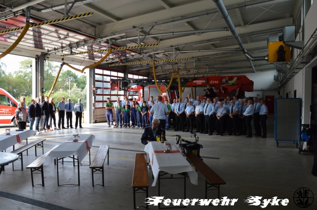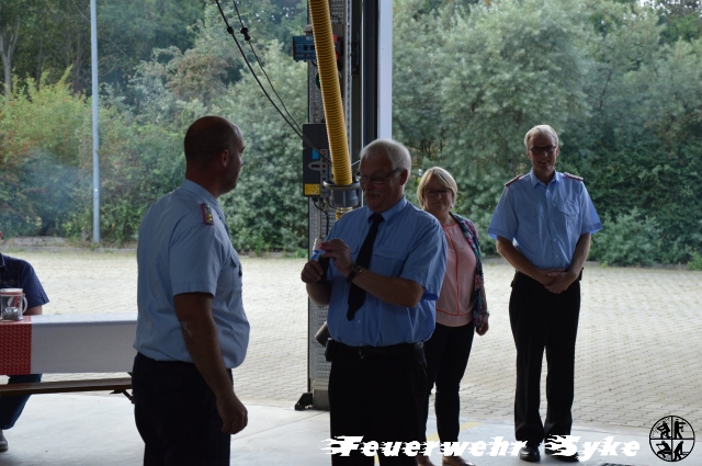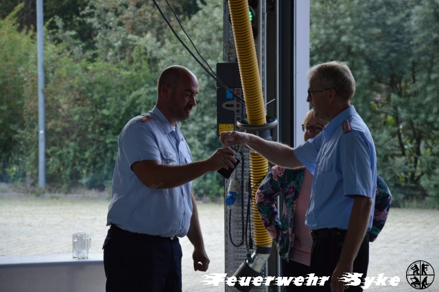 Der Großteil der Finanzierung übernahm jedoch der Förderverein der Syker Ortsfeuerwehr, der mit dem Vorsitzenden Günther Ribke, ebenfalls bei der Übergabe zugegen war. In einem feierlichen Rahmen beging die Ortsfeuerwehr die Übergabe mit Mitgliedern aus der Alters-, Jugend- und Einsatzabteilung, da die letzte feierliche Übergabe ebenfalls schon 17 Jahre her war. Die Ortsfeuerwehr Henstedt sorgte für das leibliche Wohl. Bürgermeisterin Suse Laue übergab zunächst den Fahrzeugschlüssel an Stadtbrandmeister Stefan Schütte, der wiederum an Ortsbrandmeister Fabian Fricke und der zu guter Letzt in die fürsorglichen Hände von Gerätewart Ralf Hoberg, der sich hoffentlich die nächsten 17 Jahre um das Fahrzeug kümmern kann. Aber auch an alle Mitglieder richtete Ortsbrandmeister Fricke seinen Wunsch, das „eigene“ Fahrzeug pfleglich und gut zu behandeln, damit es lange und zuverlässig seinen Dienst verrichten kann. Es war doch schon so viel Fleiß und Arbeit in die Beschaffungder Mittel für den Förderverein investiert worden.