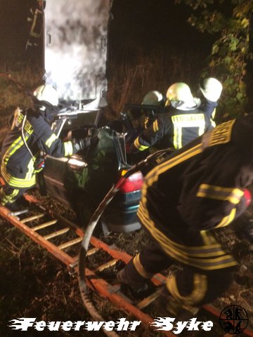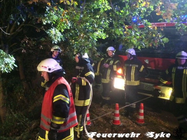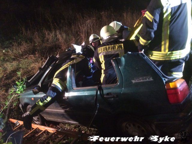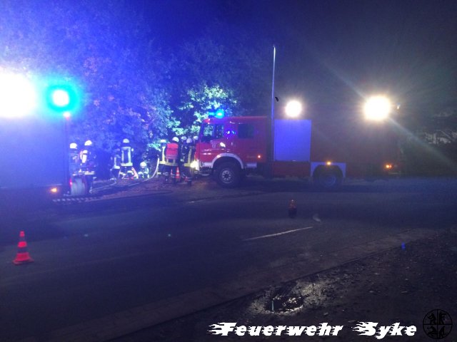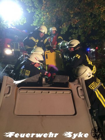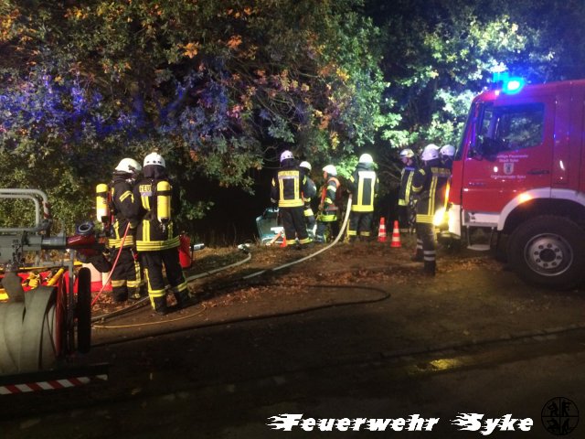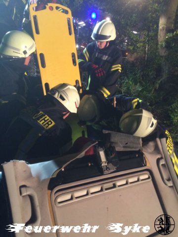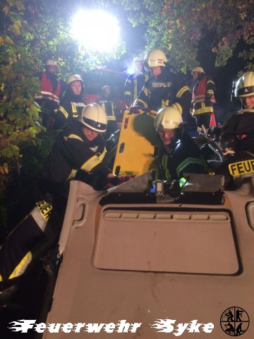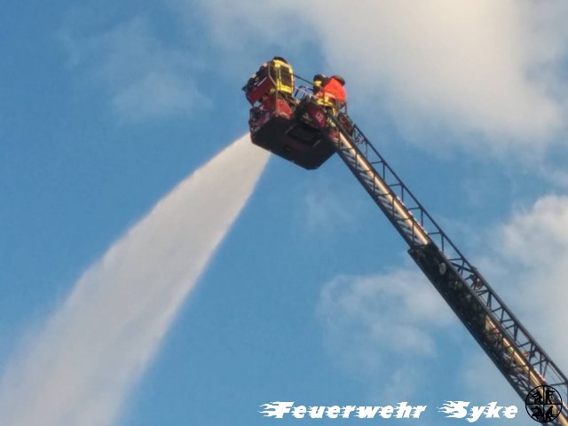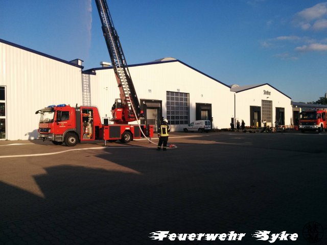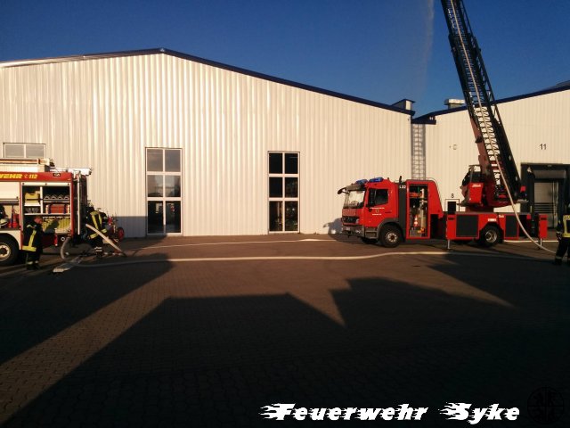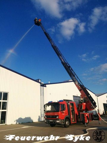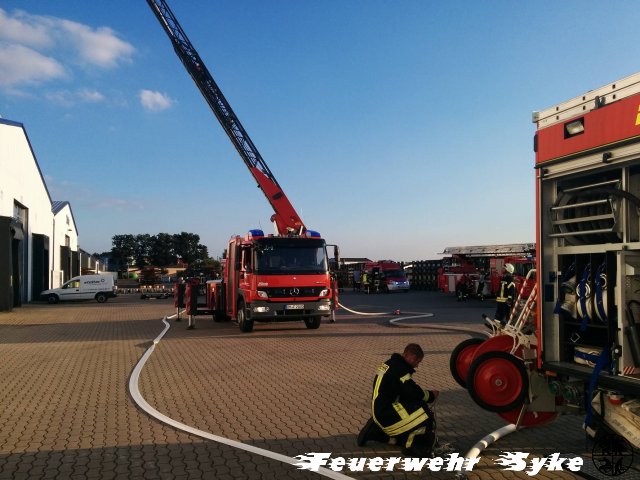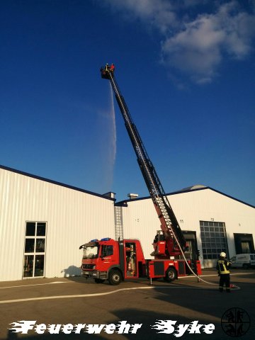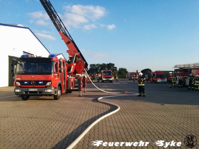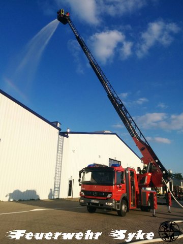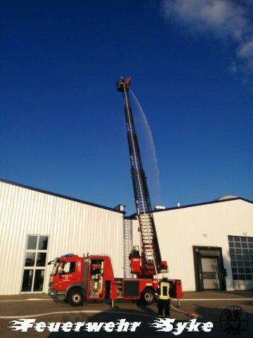 Die Ortsfeuerwehr Syke wurde im Rahmen nachbarschaftlicher Löschhilfe zu einer Alarmübung in Bassum hinzugezogen. Dort wurde in einer Lagerhalle eines ortsansässigen Betriebes im Industriegebiet ein Brand simuliert, bei dem fünf Personen als vermisst galten. Ausgerückt sind die Drehleiter und das Löschgruppenfahrzeug. Die Drehleiter wurde zur Brandbekämpfung des Feuers durch das Dach eingesetzt. Mit dem Wenderohr am Korb wurde der Brandherd bekämpft. Zwei Trupps unter Atemschutz des Löschgruppenfahrzeuges wurden mit den Kräften aus Bassum zur Menschenrettung und später zur Brandbekämpfung im Innenangriff eingesetzt. Weitere Kräfte unterstützten beim Tragen der verletzten Personen.