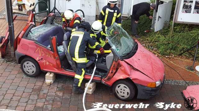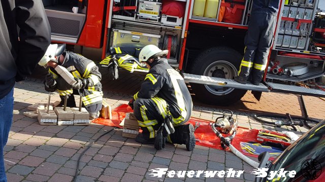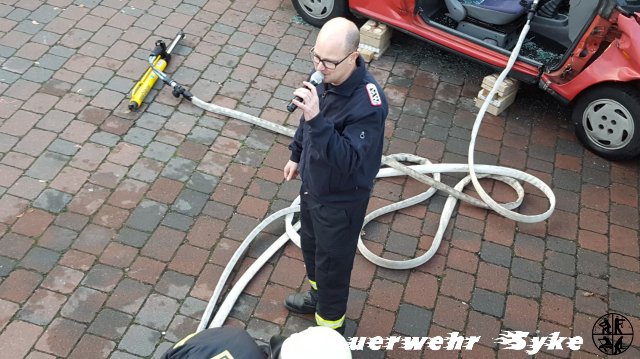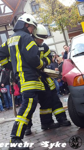 Die aktiven Kameraden demonstrierten vor Ort die technische Rettung aus einem verunfalltem Fahrzeug. Dieses wurde dabei in mehreren Schritten mit dem hydraulischen Rettungssatz bearbeitet, sodass zuerst auf beiden Seiten große Rettungsöffnungen geschaffen und schließlich auch das Dach abgenommen werden konnte. Darüber hinaus standen die Kameraden allen Interessierten zu den Fahrzeugen und der Feuerwehr Syke gerne Rede und Antwort.