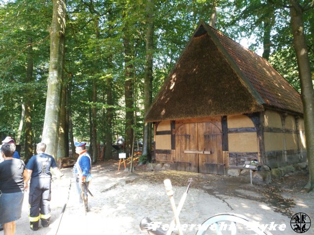Vom 26.08. - 28.08.2016 findet dort die Veranstaltung "Von Waterloo in die Grafschaft Hoya" statt. Da hier auch kleinere Gefechts- und Exerzierszenen nachgespielt werden, in denen mit Schwarzpulver geschossen wird, wollte man aufgrund der Trockenheit jegliches Risiko ausschließen und bewässerte die gefährdeten Bereiche.